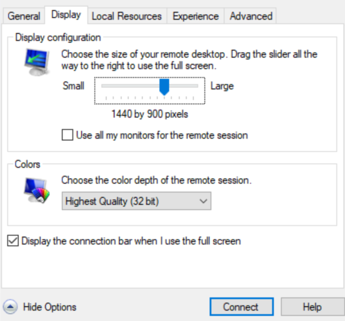 Example of changing resolution when connecting to server: