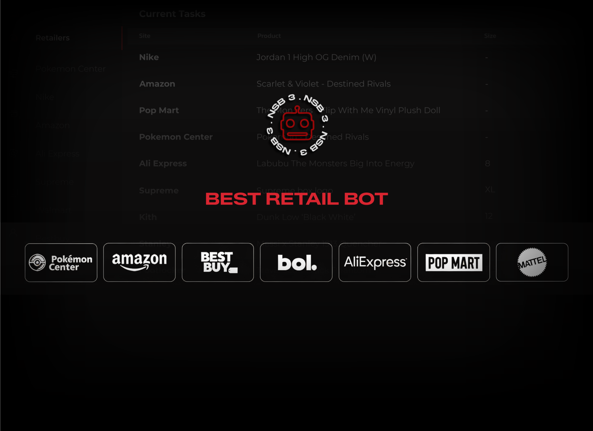 NSB is the leading sneaker bot trusted by resellers worldwide to secure hyped sneakers and collectibles at retail. With global support across Nike SNKRS, Shopify, Pokémon Center, Amazon, and 100+ retailers, NSB gives you the reach and power to win the most competitive releases.